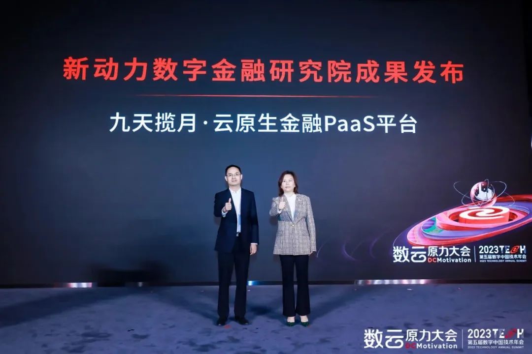 神州信息云原生与分布式首席专家、新动力数字金融研究院副院长薛春雨,中国互联网协会数字金融工作委员会执行副秘书长江艾芸共同发布